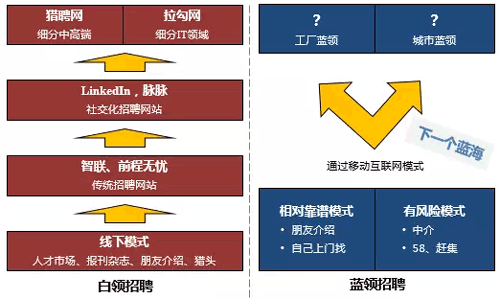 通過分析整個(gè)招聘行業(yè),我們看到白領(lǐng)招聘已經(jīng)互聯(lián)網(wǎng)化并進(jìn)入細(xì)分競(jìng)爭(zhēng)階段。由于智能手機(jī)的普及,藍(lán)領(lǐng)招聘剛剛進(jìn)入移動(dòng)互聯(lián)網(wǎng)化的窗口期,尚未有成型的玩家出現(xiàn)。信息源:揭陽人才網(wǎng)_www.jufangbo.com