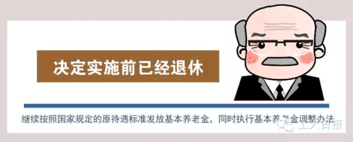 決定實(shí)施前已經(jīng)退休的人員,繼續(xù)按照國家規(guī)定的原待遇標(biāo)準(zhǔn)發(fā)放基本養(yǎng)老金,同時執(zhí)行基本養(yǎng)老金調(diào)整辦法。